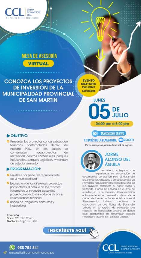 La presentación estará a cargo del Arq. Jorge del Aguila Chávez, encargado de la implementación del PDU en la Municipalidad Provincial de San Martín, presentará aproximadamente 20 propuestas de proyectos que se realizarán bajo la modalidad de Asociación Público – Privada o de Permuta, proyectos que contribuyen al desarrollo de la ciudad de Tarapoto y de la provincia de San Martín.