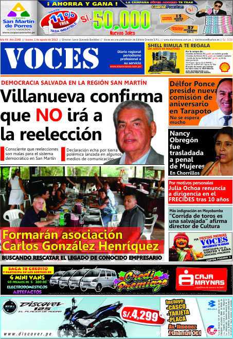 Por: Lenin Quevedo Bardález El presidente de la región César Villanueva Arévalo, confirmó que no tiene pensado postular a las elecciones para convertirse por tercera
