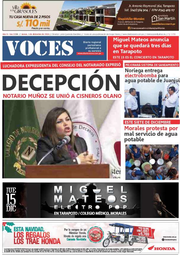 La presidenta del Frente Cívico de Defensa de los Intereses (FRECIDES) de San Martín; Semira Pérez Saavedra, cuestionó al notario Enrique Cisneros Olano, por volver