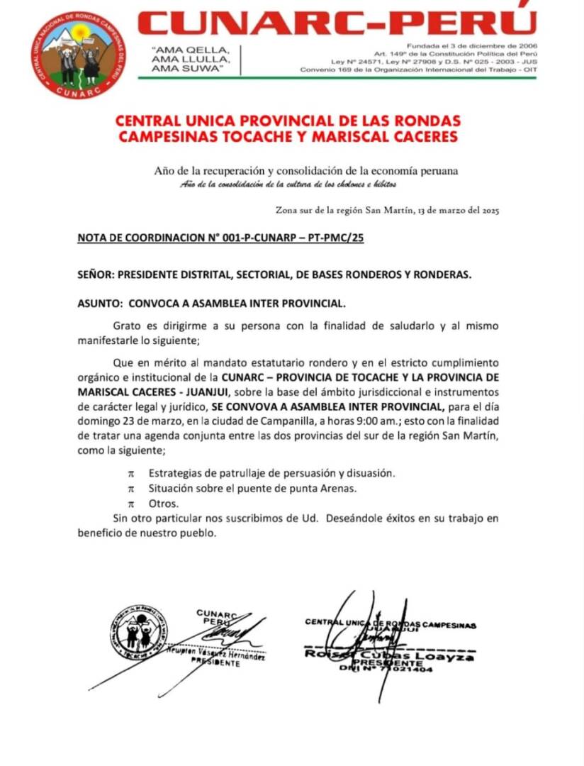 La Central Única Provincial de las Rondas Campesinas de Tocache y Mariscal Cáceres convoca a una Asamblea Interprovincial el domingo 23 de marzo en Campanilla