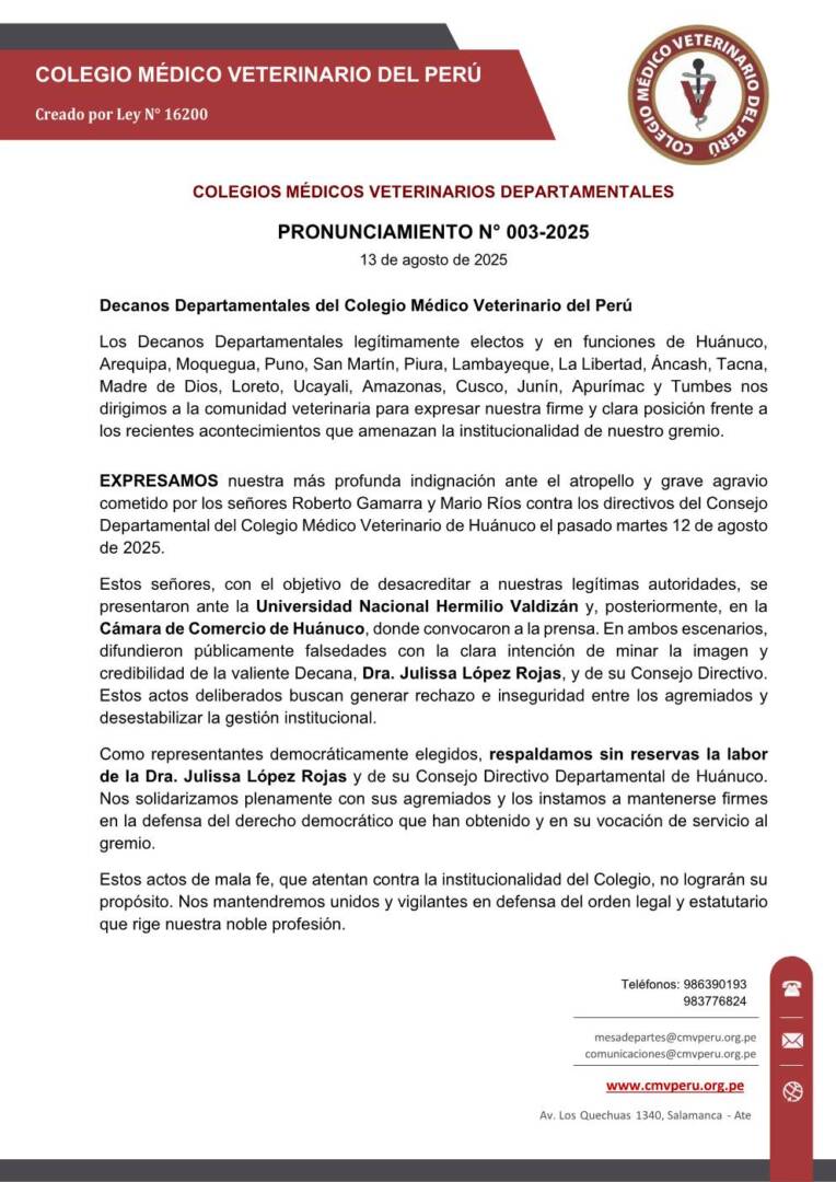 Pronunciamiento de decanos departamentales del CMVP Frente al temerario actuar delincuencial del Sr. Roberto Gamarra Riojas, hacemos un frente a nivel nacional para acabar con