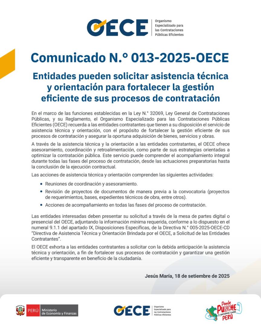 En el marco de las funciones establecidas en la Ley N.° 32069, Ley General de Contrataciones Públicas, y su Reglamento, el Organismo Especializado para las Contrataciones Públicas