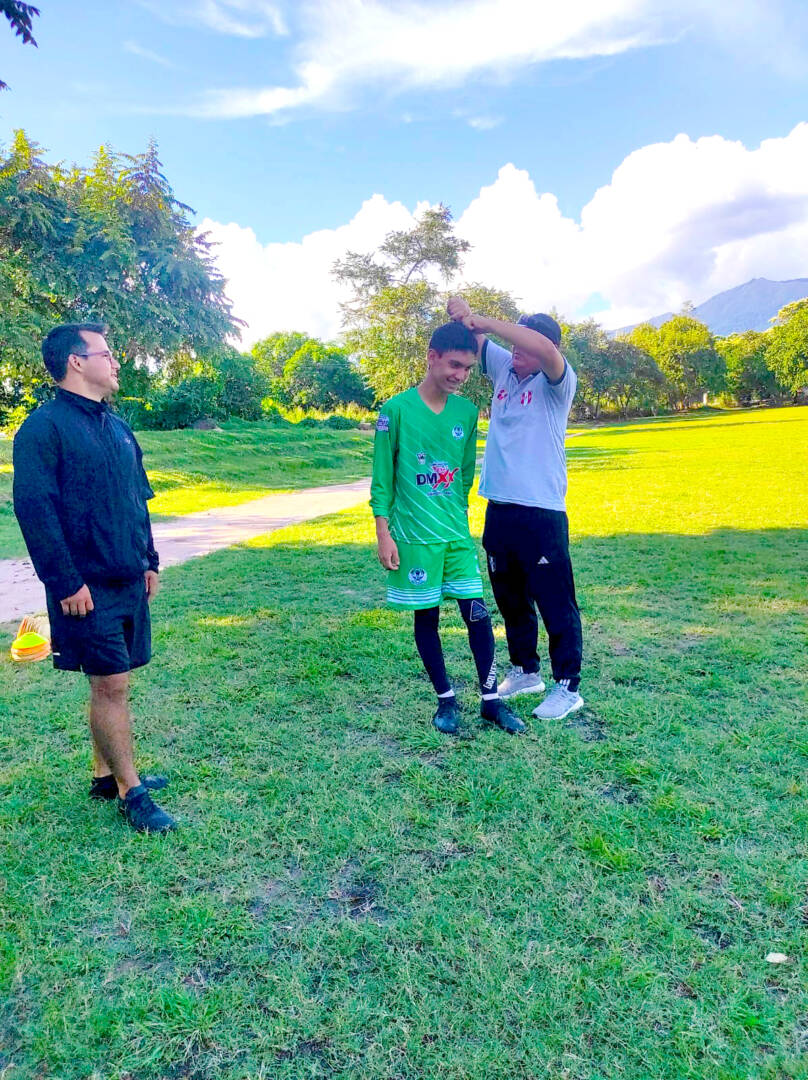 Texto foto: Joaquín Armando Rengifo Ríos es el jugador más joven del presente campeonato tarapotino, con tan solo 14 años de edad ya debutó y debe ser gran arquero del futuro, aquí el DT del equipo Jimi Saldaña cortándole el pelo en su debut.