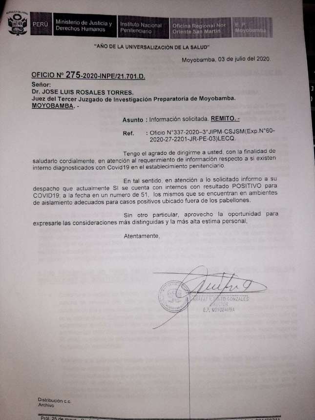 La situación se ha complicado en el Penal San Cristóbal de Moyobamba, en las últimas horas se ha revelado documentos que demuestran la grave crisis que atraviesa dicho Centro Penitenciario. Esta corresponsalía tuvo acceso al oficio Nº 275 de fecha 03 de julio 2020, remitido por el Director del penal Arafat Pinto Gonzales al Juez del Tercer Juzgado de Investigación Preparatoria de Moyobamba Dr. José Luis Rosales Torres, quien días antes le había solicitado informar si existen internos que se encuentren con Coronavirus.
