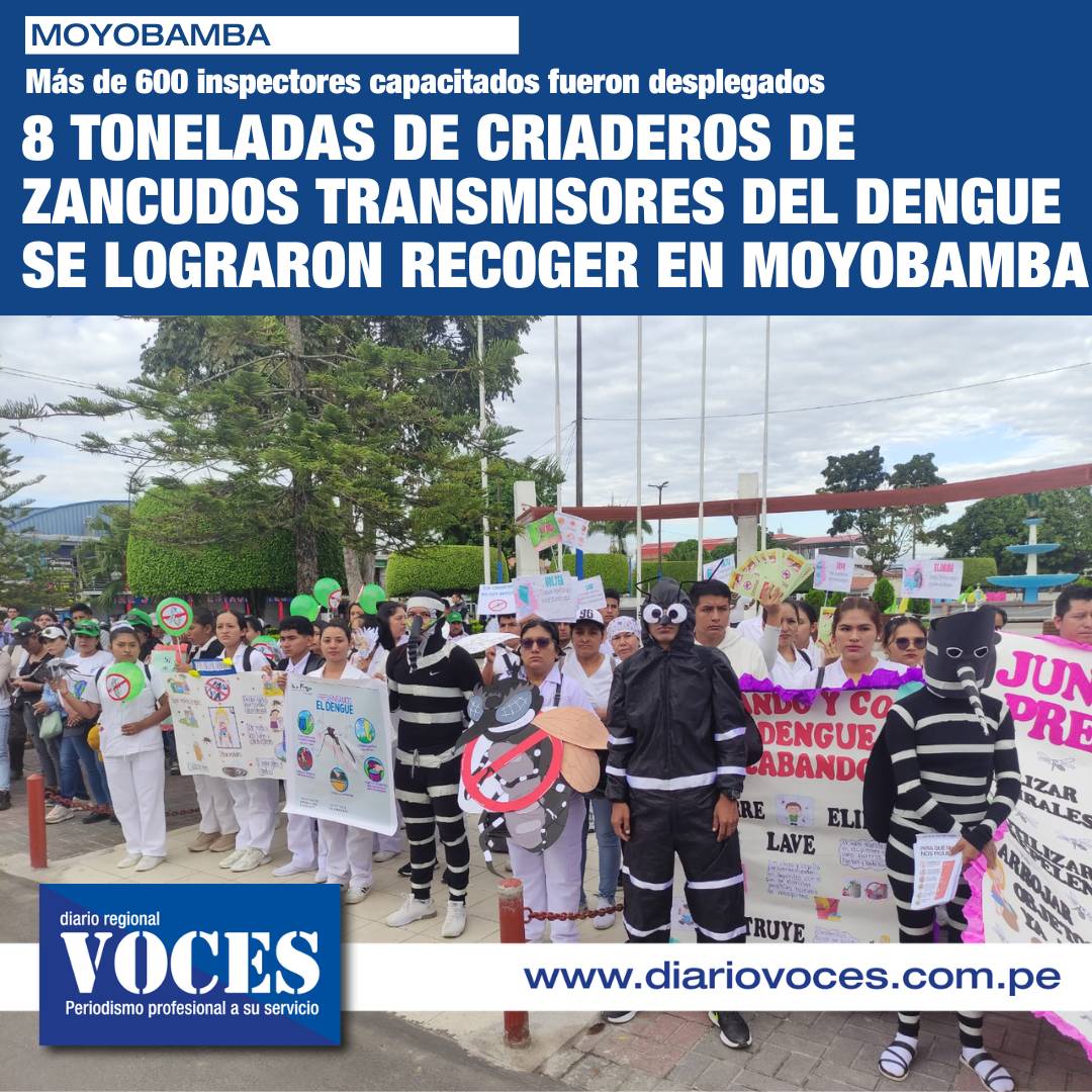 En un esfuerzo conjunto entre el Gobierno Regional San Martín y la Municipalidad Provincial de Moyobamba, se logró recoger y eliminar 8 toneladas de criaderos del zancudo transmisor del dengue con más de 600 inspectores capacitados, durante la  masiva campaña desarrollada en Moyobamba (distrito).