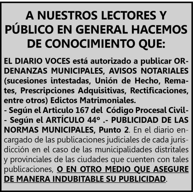 EL DIARIO VOCES está autorizado a publicar ORDENANZAS MUNICIPALES, AVISOS NOTARIALES (sucesiones intestadas, Unión de Hecho, Remates, Prescripciones Adquisitivas, Rectificaciones, entre otros) Edictos Matrimoniales.