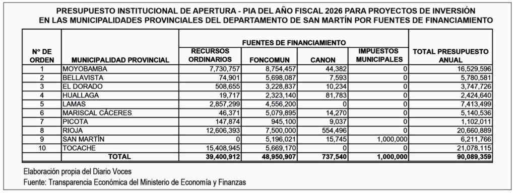 En pleno año electoral, el Presupuesto Institucional de Apertura (PIA) 2026 de las municipalidades provinciales de San Martín revela no solo el volumen de recursos que se manejarán, sino también la urgencia de una mirada crítica y permanente de la ciudadanía y de los órganos de control. El análisis de las fuentes de financiamiento – recursos ordinarios, FONCOMUN, canon e impuestos municipales – deja en evidencia marcadas asimetrías y focos que merecen especial atención para evitar que el gasto público se convierta en herramienta proselitista o en botín de mala gestión.