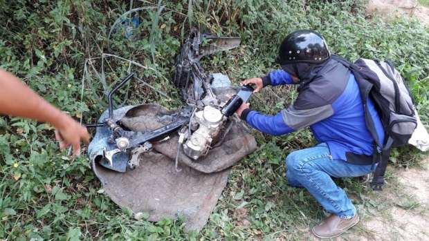 El vehículo es marca Honda, modelo Wave y solo tiene dos años de uso, hasta el momento los agentes policiales no logran entender, porque no desarmaron el motor, tampoco descartan que haya sido llevado en una camioneta al lugar donde fue encontrado envuelto en una alfombra de color celeste.
