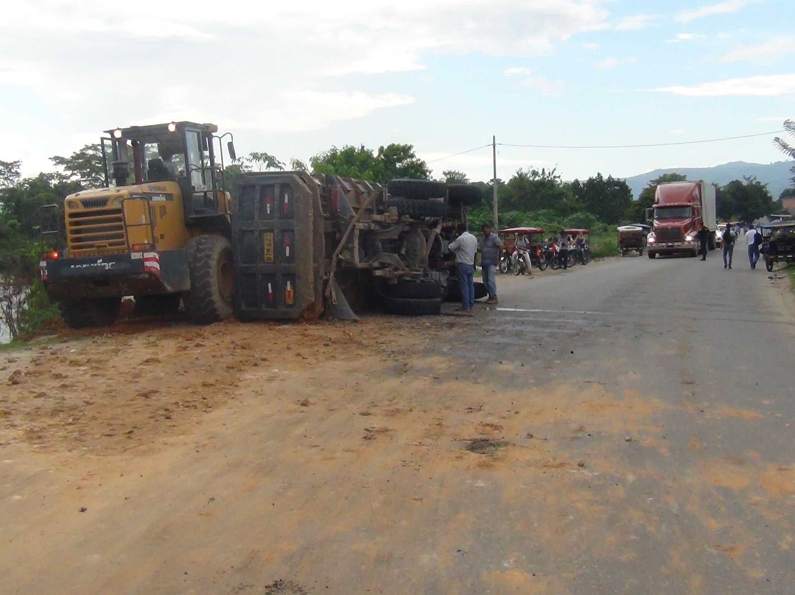 Un volquete cargado de tierra, que manejaba Samuel Poclin Más, se volcó al reventar un neumático de la parte posterior, fue a dar a un costado de la pista, casi ocasiona un choque con una moto lineal que conducía la señorita Bárbara Saldaña (30).