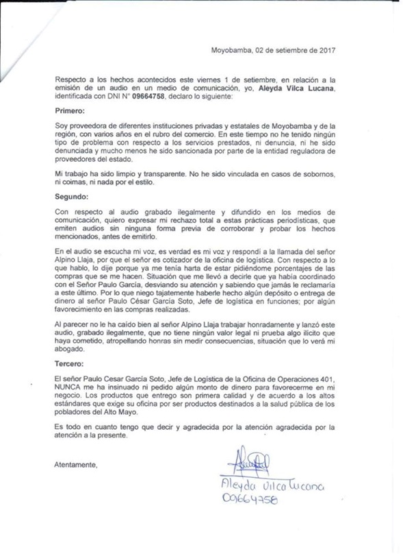 Moyobamba. A través de un documento de fecha 02 de septiembre, la señora Aleyda Vilca Lucana, proveedora de la unidad de Operaciones 401 que se encuentra involucrada en el denominado audio de la “repartija” en su defensa afirma que en la conversación que sostuvo con el trabajador Alpino Llaja Díaz, se vio obligada a mencionar que había hecho un depósito a la cuenta del exjefe de logística Paulo García Soto debido a que este trabajador le llamaba incesantemente solicitándole el pago de comisiones.