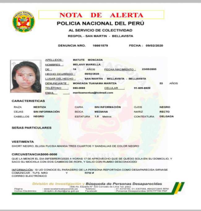 Se trata de la adolescente Melany Mariella Matute Moncada, quien según sus características es de 1 metro 50 centímetros de estatura, contextura delgada, ojos y cabellos negros. Al momento de su desaparición vestía un short negro, blusa fucsia con mangas de tres cuartos y sandalias color negro.