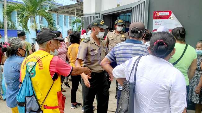 Los beneficiarios de los programas sociales desde ayer vienen realizando largas colas en los exteriores del Banco de la Nación de Tarapoto, debido a la cantidad de personas esperando turno para ingresar a esa entidad financiara, no hubo ingreso preferencial. Agentes de la Policía Nacional y los vigilantes en todo momento pusieron orden para evitar inconvenientes.