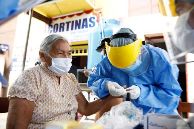 Los adultos mayores que acudieron ayer al Banco de la Nación de Tarapoto a recibir su Pensión 65 fueron vacunados contra la influenza y neumococo y pasaron por pruebas rápidas de descarte de COVID 19.