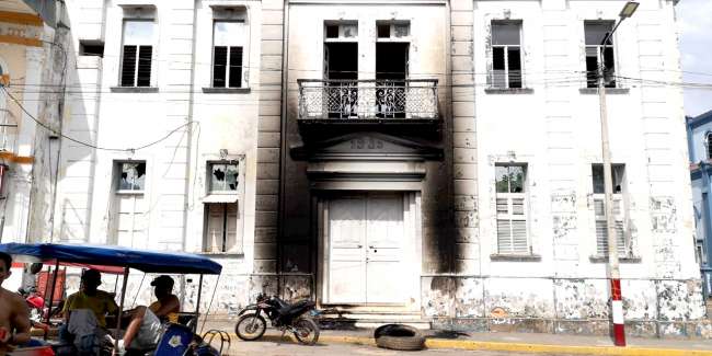 Texto de Imagen: Así quedó exlocal de subregión de Alto Amazonas, por protestas de trabajadores de construcción civil