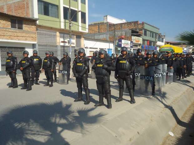 Agentes de la División de Operaciones Especiales (DINOES) y de la Unidad Antimotines de la Policía Nacional, se encuentran en el distrito de Nueva Cajamarca esperando órdenes superiores para desbloquear la carretera Fernando Belaúnde Terry en el puente Yuracyacu, lugar donde se encuentran atrincherados decenas de productores de arroz que se encuentran en pie de lucha.