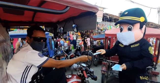Para esa actividad las entidades públicas y privadas donaron a la región Policial 2 mil mascarillas para repartir entre los transeúntes y conductores de trimóviles y de esa manera incentivarles para el buen uso como medida de protección contra la pandemia. Algunos agentes policiales se vistieron de muñecos para amenizar la campaña.
