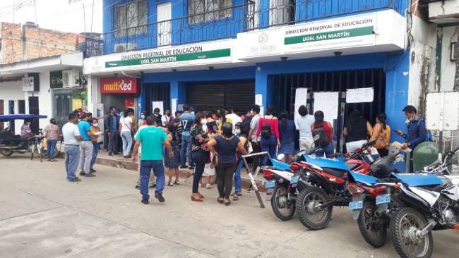 Todos los días en los exteriores de la Unidad de Gestión Educativa Local de San Martín, decenas de profesores realzan largas colas sin respetar el distanciamiento social, en momentos que realizan diferentes trámites y gestiones. Mientras que el mercado dos de Tarapoto ya no existe control de bioseguridad y los tanques de agua para el lavado de manos están vacíos.
