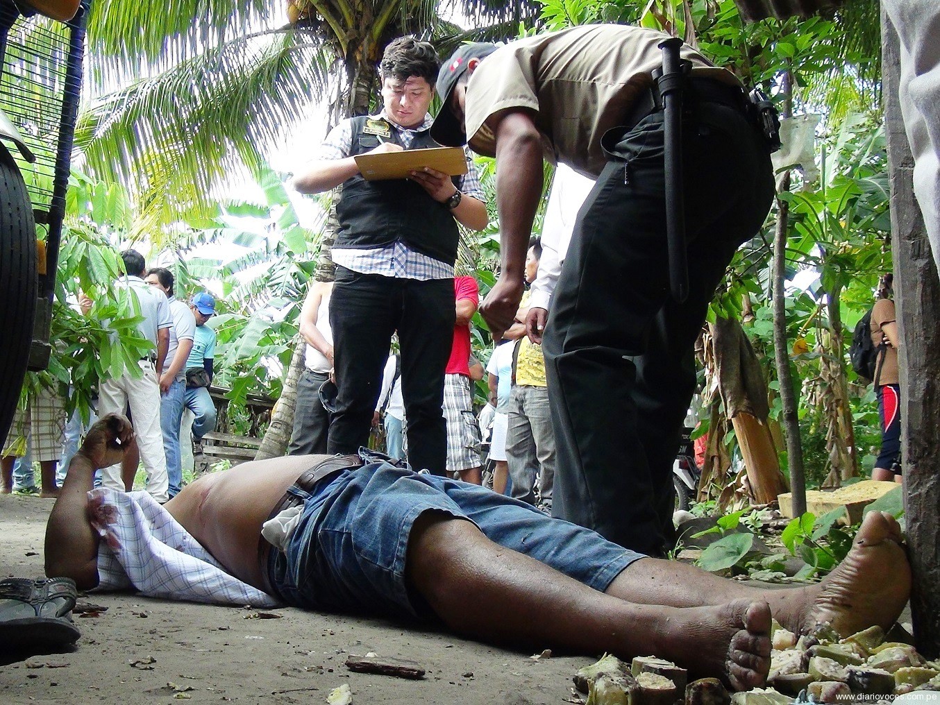 El cuerpo de Ángel Ruiz Pinedo de 51 años de edad fue encontrado por su esposa, debajo de su trimóvil en el fundo que tenía a la altura del kilómetro uno de la nueva Vía de Evitamiento, frente a un cabaret de la zona, la víctima tenía una mano sobre la cadena de su vehículo, lo que hace presumir a la policía que trató de buscar auxilio, sin embargo debido al corte que tenía en el cuello, falleció prácticamente desangrado.