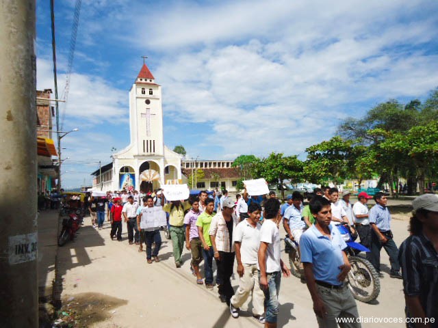 Saposoa. Cerca de 200 agricultores de las comunidades Víctor Raúl Haya de la Torre, La Unión, Collpa, Nuevo Huánuco, Nuevo Chontali, Nuevo Piura, Playa Hermosa, Corazón de Pachiza, Nuevo Porvenir y Flor de Café de los distritos de Sacanche y El Eslabón de la provincia de Huallaga, realizaron una movilización pacifica por el perímetro de la plaza de Armas de Saposoa e hicieron un plantón en el frontis de la Municipalidad Provincial de Huallaga.