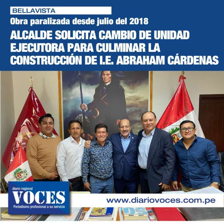 Después de 8 años de abandono en la ejecución de la infraestructura del colegio Abraham Cárdenas de Bellavista, el Alcalde de Bellavista, solicito la unidad ejecutora para gestionar el presupuesto para su ejecución, que supera los 45 millones de soles, así lo dio a conocer el Alcalde, Salvador Campos en la última reunión sostenida con el congresista Héctor Valer Pinto quien le dio a conocer que ya ha presentado la solicitud para el cambio de unidad ejecutora, ante el Programa Nacional de Infraestructura Educativa (PRONIED) del Ministerio de Educación.