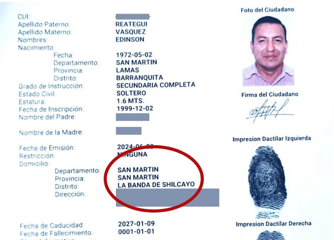 En un caso sui géneris, el alcalde en funciones del distrito de Buenos Aires, jurisdicción de la provincia de Picota, Edinson Reátegui Vásquez, ha cambiado repentinamente su residencia, de vivir en el distrito donde fue electo, hoy su ficha RENIEC confirma que se cambió de domicilio en junio 2024, al distrito de La Banda de Shilcayo, se sabe que postularía a una nueva alcaldía en el distrito bandino.