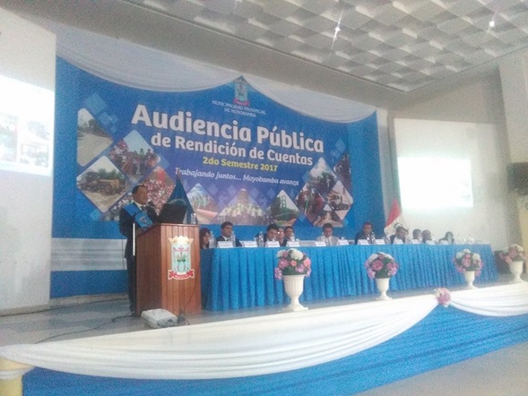 Moyobamba. En los ambientes del auditórium del Colegio Ignacia Velásquez, ayer viernes el alcalde de Moyobamba Oswaldo Jiménez Salas dirigió la audiencia pública de rendición de cuentas del periodo 2017, la autoridad edil estuvo acompañado de sus gerentes y jefes de área.