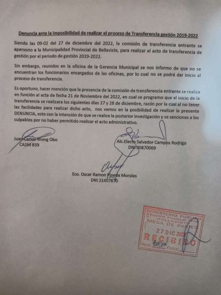 Una posición que se puede entender, ya que anteriormente una propia funcionaria de esa comuna denunció la desaparición de documentos y de discos duros de algunas máquinas de computadoras de oficinas estratégicas, por esa misma razón el electo alcalde decidió, junto a su equipo técnico suspender el proceso de transferencia. Es más, por decisión del alcalde entrante se procedió hacer una denuncia ante la fiscalía de Bellavista, debido a la negativa del alcalde y a la no presencia de sus funcionarios de línea.