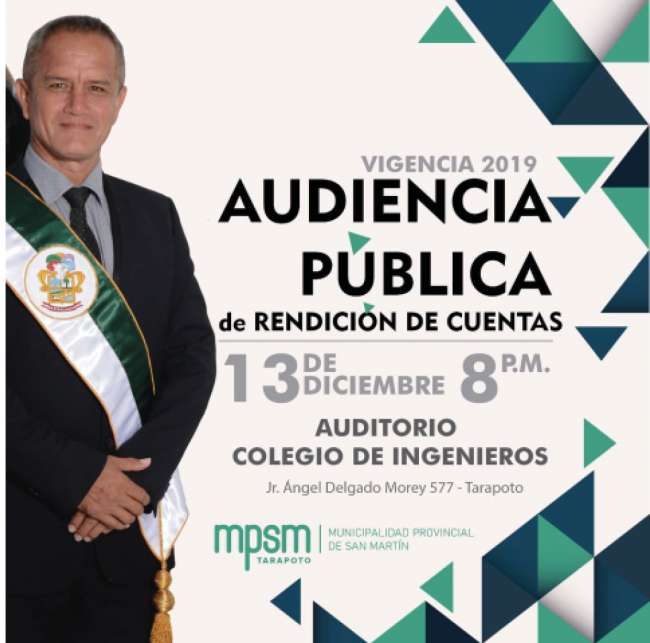Cumpliendo con lo que señala la Ley Orgánica de Municipalidades, el burgomaestre tarapotino Arqº Tedy del Aguila Gronrthe realizará la Audiencia Pública de Rendición de Cuentas el 13 de diciembre a partir de las 8 de la noche en el auditorio del Colegio de Ingenieros del Perú – filial San Martín-Tarapoto.