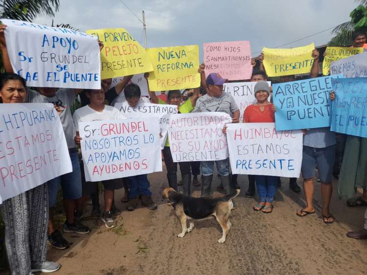 Justamente buscando solución al problema, ayer la población del Centro Poblado Santiago de Borja, de los distritos de Barranquita, Papaplaya, El Porvenir -Pelejo, Navarro y Chipurana protestaron exigiendo la inmediata intervención del gobierno central, regional, provincial y local, para implementar rápidas acciones ante el inminente colapso del puente ya que afectaría dejando aislados a pobladores del Bajo Huallaga. El tránsito de vehículos de alto tonelaje que superan la capacidad del puente -35 toneladas – serían los causantes del daño a la estructura, el transporte de madera, de material agregado, transporte de cargas con granos de palma. Para evitar especulaciones al lugar llegaron técnicos de la Dirección Regional de Transportes – DRTC – para realizar un trabajo topográfico para analizar técnicamente los daños a las estructuras y el origen del daño. A la comitiva del MTC, se sumaron los alcaldes Antony Max Barrera, del distrito del Porvenir–Pelejo; Maher Guerrero Ordoñez, del distrito de Barranquita, Isaac Apagüeño Tuanama, del distrito de Chipurana-Navarro y Raúl Juro Medina, alcalde del distrito de Papaplaya y pobladores con pancartas en mano, pedían urgente intervención de las autoridades.