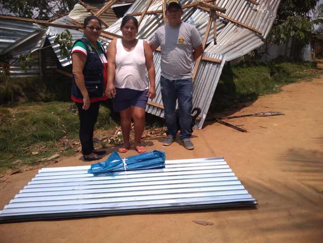 Martha Luz Torres del Águila, alcaldesa del distrito, fue quien comandó directamente la entrega de las 15 calaminas y 20 metros de hule que le correspondió a cada damnificado, cuya donación fue en la casa de la familia que perdió sus techos.