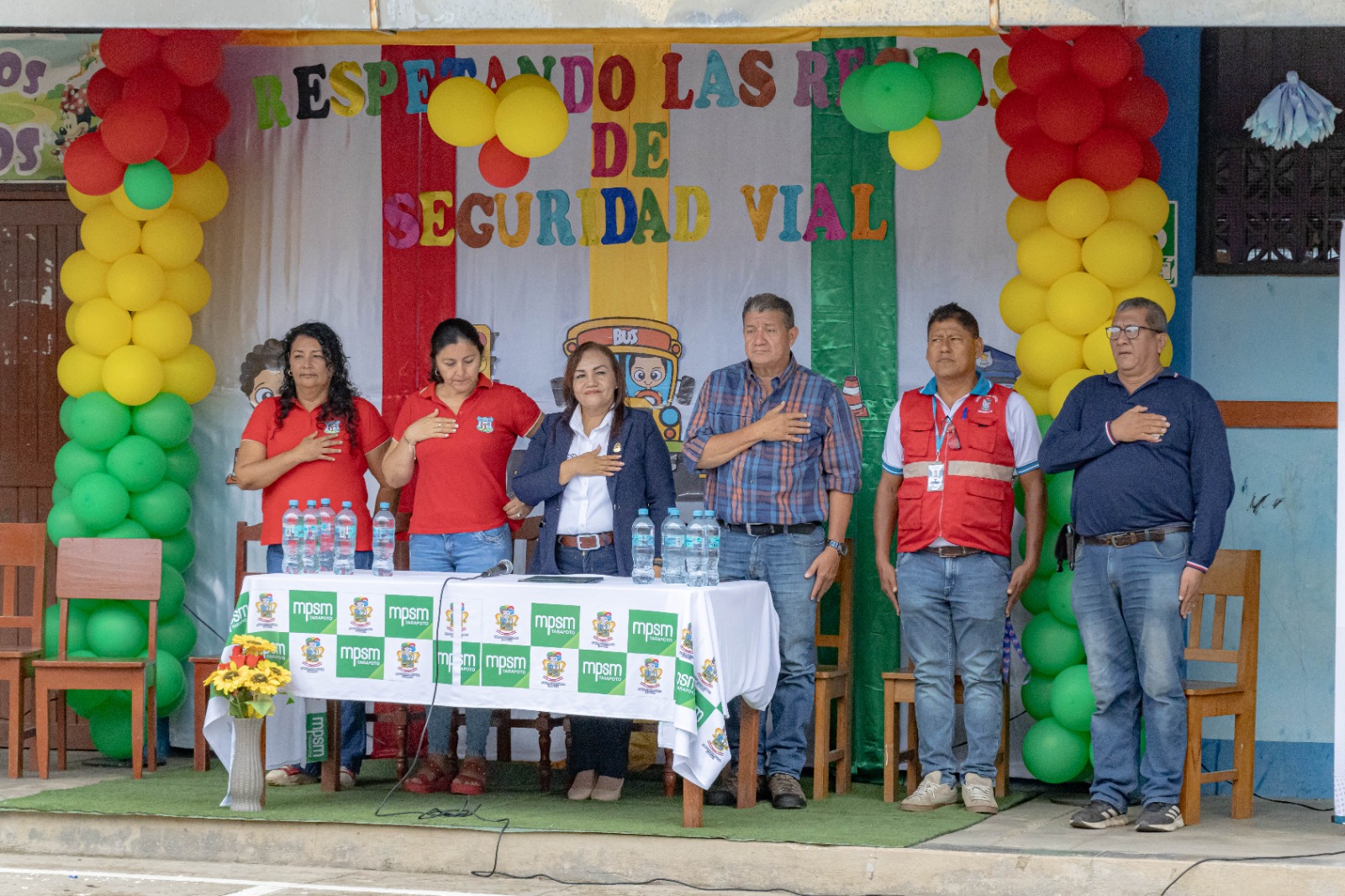 Acompañaron a Lluni Perea, el gerente municipal, William Ríos Trigozo, directora de la institución educativa Prof. Pilar Flores Pérez, Cmdte. Eliseo Vásquez Rojas, subgerente de la subgerencia de Tránsito, subdirectora Prof. Mónica Guevara Meléndez y el Tec. PNP (r) Caleb Mora Reynoso.