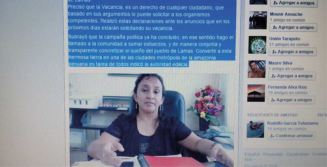 Mediante la cuenta de Facebook del responsable de Imagen Institucional de la Municipalidad de Lamas, Rosa Isabel Acuña Pinedo, afirma ser la alcaldesa provisional de la provincia de Lamas, y que no le tiene miedo a la vacancia, porque “no hizo nada malo en contra de su pueblo”.