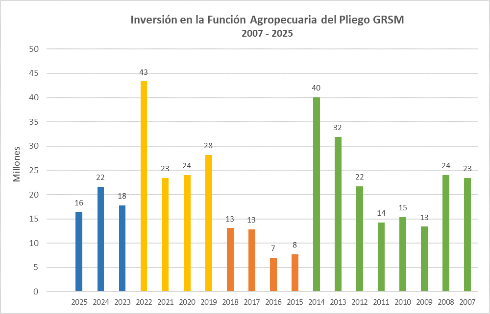 En todas las gestiones regionales, en sector agropecuario fue considerado el patito feo, pues la inversión en el sector lo refleja así.  En periodo comprendido del 2007 – 2025; en promedio alcanzó los 20 millones anuales, que representa el 4.95 % del presupuesto total a nivel PIM. Aquí un gráfico que muestra que detalla.