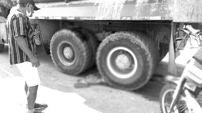 Un trágico accidente de tránsito ocurrió ayer por la mañana en la urbanización Nueve de Abril de Tarapoto, a consecuencia de ello falleció una persona de 85 años de edad que se desplazaba como pasajero en un trimóvil que impactó con un volquete, muriendo instantáneamente al ser aplastado por las llantas posteriores. La esposa de la víctima, su menor hijo y el mototaxista resultaron ilesos.