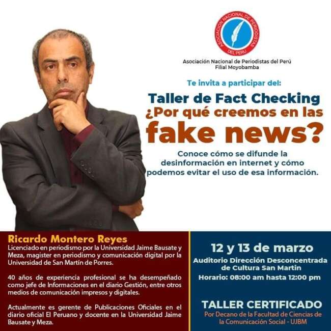 El Taller de Técnicas «Fact Cheking”, se realizará este sábado 12 de marzo en los ambientes de la dirección desconcentrada de Cultura de San Martín, cito en el jirón Benavides #388 Moyobamba.