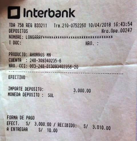 Moyobamba. Un Boucher que demuestra el depósito de 3 mil soles a nombre de un sujeto de apellido Longaray ayer martes se nos hizo llegar a esta corresponsalía y al mismo tiempo fue publicado en las redes sociales , de acuerdo a la información obtenida, el nombre exacto de la persona que recepcionó el dinero sería Cesar Alberto Longaray Rocha quien bajo argumentos de tener contactos en la UGEL Moyobamba, estafó a más de 20 docentes de las provincias de Moyobamba y Rioja quienes buscaban alcanzar una plaza por contrato.
