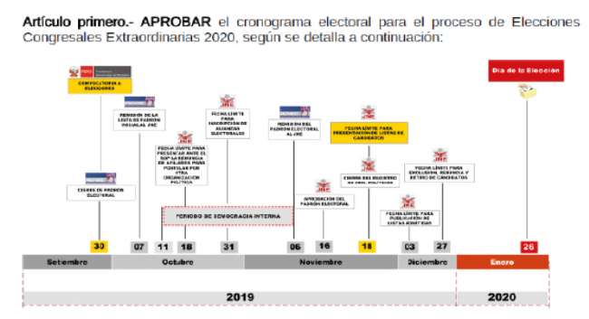 El Pleno del Jurado Nacional de Elecciones (JNE) aprobó hoy el cronograma electoral, los plazos y el marco normativo que regirá en las elecciones parlamentarias del 26 de enero de 2020.