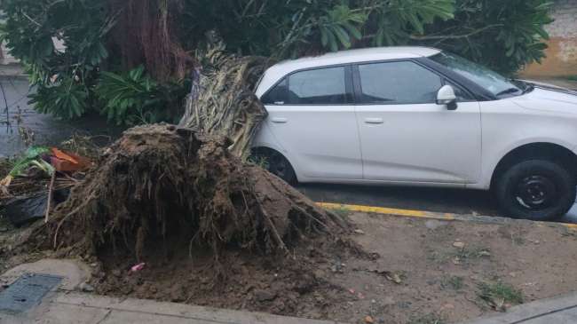 Ayer nuevamente se registró una torrencial lluvia en Tarapoto, inundando varias viviendas en diferentes sectores de la ciudad, sin embargo, en el barrio Partido Alto, un enorme árbol de renaco se desprendió y al caerse aplastó un automóvil estacionado, poniendo en zozobra a los vecinos de la zona, quienes de inmediato solicitaron la presencia de los serenos de la Municipalidad Provincial de San Martín.