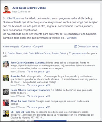 Frente a aquello, el joven Julio David Albitres respondió en su cuenta de Facebook: “Sr. Kike Flores me ha tildado de inmaduro en un programa radial el día de hoy. Quiero aclararle que el hecho que uno sea joven no implica que tenga que aceptar que me lleven de un lado para el otro, según su conveniencia. Somos jóvenes, pero ciudadanos respetuosos. Me ha calificado de no ser valiente para enfrentar al precandidato Pezo Carmelo. También debo explicarle que la verdadera valentía está en respetar y hacer respetar “la palabra de honor”, por encima de todo. Me interesó esta posibilidad de ser candidato a Morales, porque creí en un liderazgo que pensaba que era serio. Pero de ninguna manera puedo participar en un proyecto en el que la deslealtad, la traición, la mentira y falta de decencia son las rectoras. No se pueden hacer cambios imprevistos faltando 3 días para la fecha final. No señor Flores. Por el contrario a lo que usted piensa, esta es una actitud con la madurez y la valentía que tiene la juventud que no se deja abusar por nada ni nadie. / Asi piensa trabajar por la juventud cuando nos usa y nos engaña”.