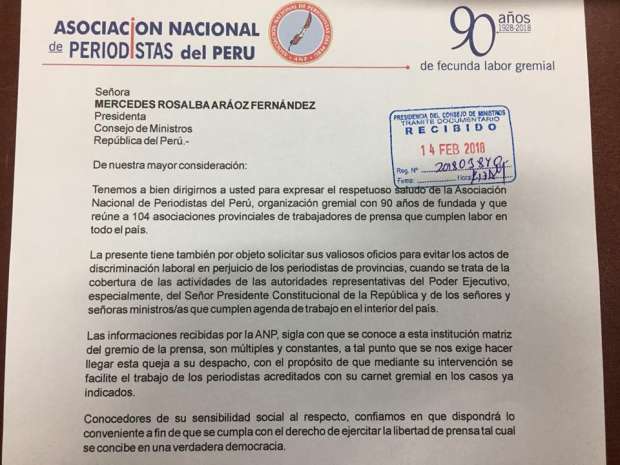 En el documento señalan que las quejas de periodistas de las regiones del país son múltiples y constantes por lo que hacen llegar esta queja, para que mediante su intervención se facilite el trabajo de los periodistas acreditados en los casos indicados.