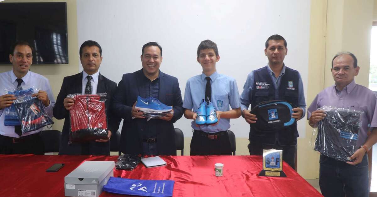 Dayton Monteza Pérez, atleta de la I.E. Serafín Filomeno, de alto rendimiento, recibió de manos del alcalde moyobambino, Ronald Gárate Chumbe, toda la indumentaria deportiva que usará, cuando le toque representar a nuestro país en el Campeonato Nacional Escolar Sudamericano Chile 2023,