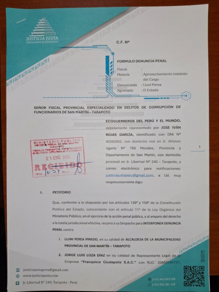 La acción legal fue interpuesta por la organización Ecoguerreros del Perú y el Mundo, representada por José Iván Rojas García, e incluye también como denunciado a Jorge Luis Loza Díaz, representante legal de la empresa Franquicia Ciudadpolis S.A.C. El Estado figura como agraviado.