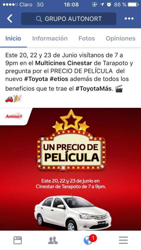 Este 20; 22 y 23 de junio visita de 7 a 9 pm en Multicines Cinestar de Tarapoto y pregunta por el precio de Película del nuevoToyota Etios, además de todos los beneficios que te trae el #ToyotaMás.