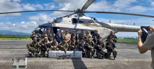 La policía en el lugar encontró cuatro costales con alcaloide cocaína, con un peso aproximado de 150 kilogramos, un fusil automático M-4, una radio de comunicación y seis timbos con contenido al parecer acetona, que es un insumo para la elaboración de droga.