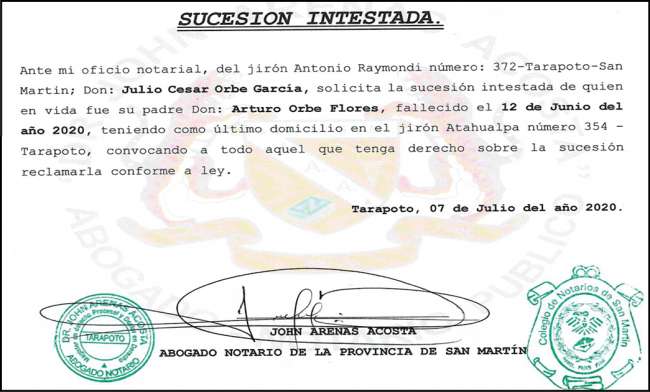 San Martin; Don: Julio Cesar Orbe García, solicita la sucesión intestada