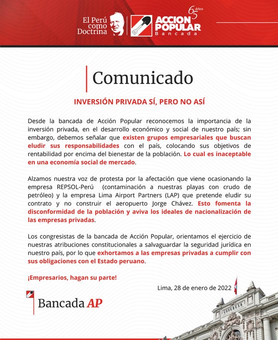 “Desde la bancada de Acción Popular reconocemos la importancia de la inversión privada, en el desarrollo económico y social de nuestro país; sin embargo, debemos señalar que existen grupos empresariales que buscan eludir sus responsabilidades con el país (…) Lo cual es inaceptable en una economía social de mercado”, precisa el documento.