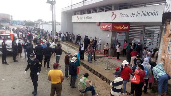 Masiva afluencia de adultos mayores, aquí no se cumple ni una sola recomendación de la emergencia sanitaria. Los policías, militares, serenazgo y personal de seguridad particular no pueden atender ni controlar la masiva presencia de personas que pugnan por cobrar el bono otorgado por el estado.