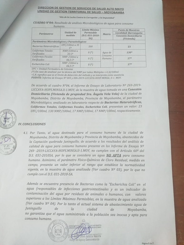 El documento señala textualmente que de acuerdo al cuadro Nº 4, el informe de ensayo de laboratorio Nº 262/2019 – LICAYA-HOSPITAL – MINSA –II-I-Moyobamba, el parámetro microbiológico analizado en los laboratorios respecto de bacterias heterotróficas coliformes totales, coliformes fecales, Echirichia Coli, presentan un valor 23 UFC/100 ml.130 NMP/100ML. 17 NMP/ 100 ml., respectivamente. Indicando que, de acuerdo a estos resultados, el agua destinada para el consumo humano de la ciudad de Moyobamba, abastecidos de la captación de la quebrada Juninguillo de acuerdo a los resultados de los analices de calidad de agua para el consumo humano presente en los informes de ensayo Nº 262/2019 –LICAYA-HOSPITAL –MINSA –II-I-Moyobamba, no cumplen con el art. 60 del D.S Nº 031 -2010. Por lo que se considera un agua no apta para el consumo humano. Así mismo, el parámetro físico químico de cloros residual, medido en campo, presenta un valor inferior al rango que establece la normatividad vigente.