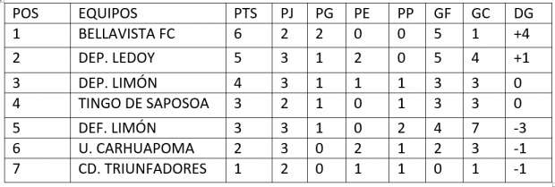 Producto de sus dos triunfos con la dirección técnica del profesor Ruller Ríos Peñaherrera, la escuadra más popular y de mayor hinchada, Bellavista FC., se encuentra liderando el campeonato de la Copa Perú-distrital con 6 puntos y con cinco goles a su favor.