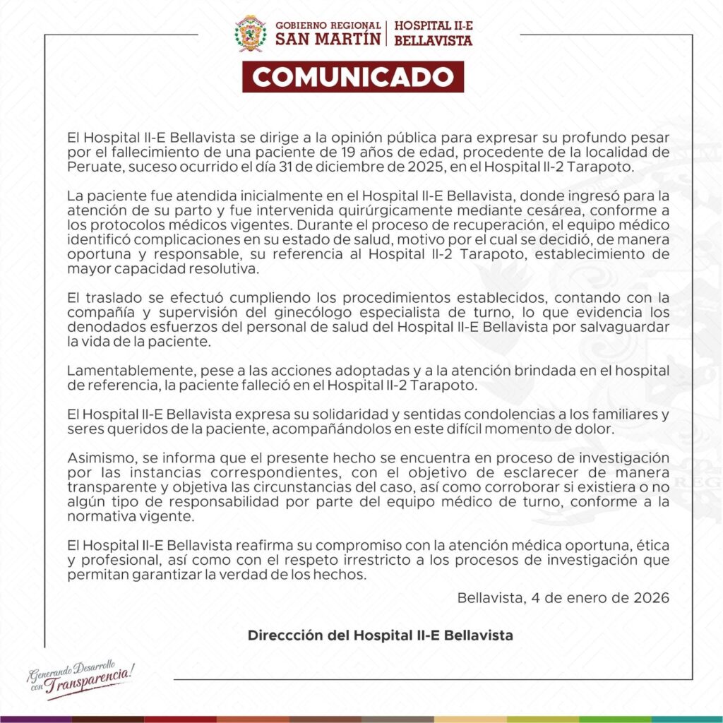 Intervención y derivación de emergencia. Según el comunicado oficial, la paciente, natural de la localidad de Peruate, ingresó al establecimiento para la atención de su parto, donde se le practicó una cesárea conforme a los protocolos vigentes. No obstante, se habrían presentado complicaciones durante el postoperatorio, motivo por el cual fue referida de manera inmediata al Hospital II-2 de Tarapoto, al contar este con mayor capacidad resolutiva.